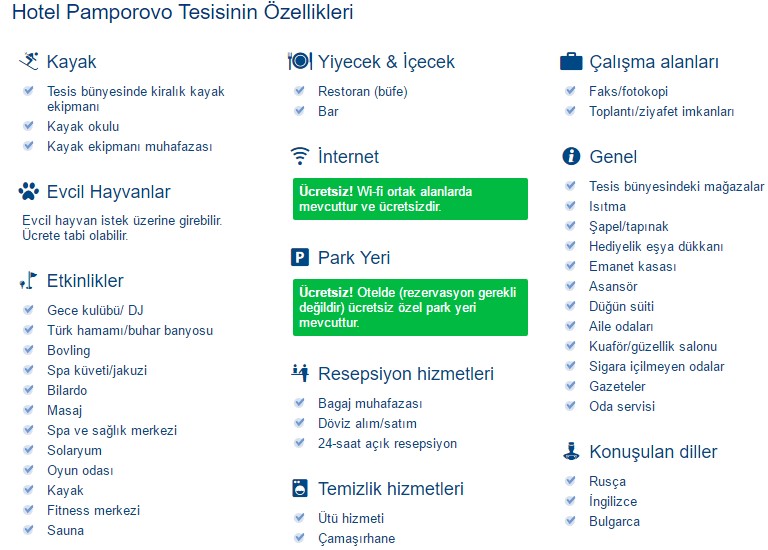 Pamporovo Hotel'in tüm odalarında balkon, kaliteli mobilyalar ve geniş banyolar bulunmaktadır. Pamporovo oteldeki bar ve restoranlarda gurme yemeklerin yanı sıra birçok içki çeşidi de servis edilmektedir. Hotel Pamporovo Palace’da Bulgar mutfağı ve ızgara yemekler ve çeşitli Avrupa lezzetleri sunulmaktadır. Pamporovo Hotel’de mini bir Irish Pub da bulunmaktadır. Hotel Pamporovo’nun terapi merkezinde SPA, sauna, buhar odası ve kapalı havuzdan oluşmaktadır. Pamporovo’nun büyük, kapalı yüzme havuzunda yüzerek kendinizi tazeleyin, saunada dinlenin veya uzman Asyalı terapistlere masaj yaptırarak kendinizi şımartın.