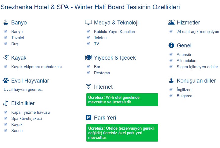 Kompleks; kapalı yüzme havuzu, sauna, jakuzi, solaryum, SPA merkezi ile misafirlerine dinlenme ve eğlence için birçok seçenek sunmaktadır. Kısaca Snezhanka misafirlerine kış tatillerinde dinlendirici bir konaklama imkanı sunmaktır.